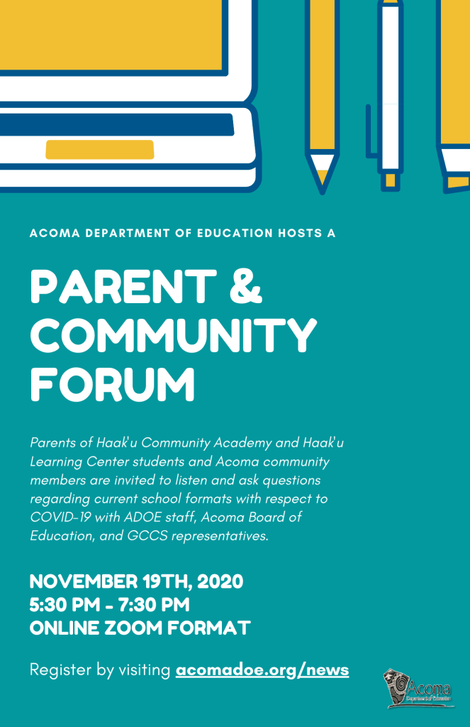 Haak’u Community Academy and Haak’u Learning Center Families. Please use link below to register for this forum. Community participation is encouraged and appreciated. Any questions, please contact the ADoE office (505) 552-6077.