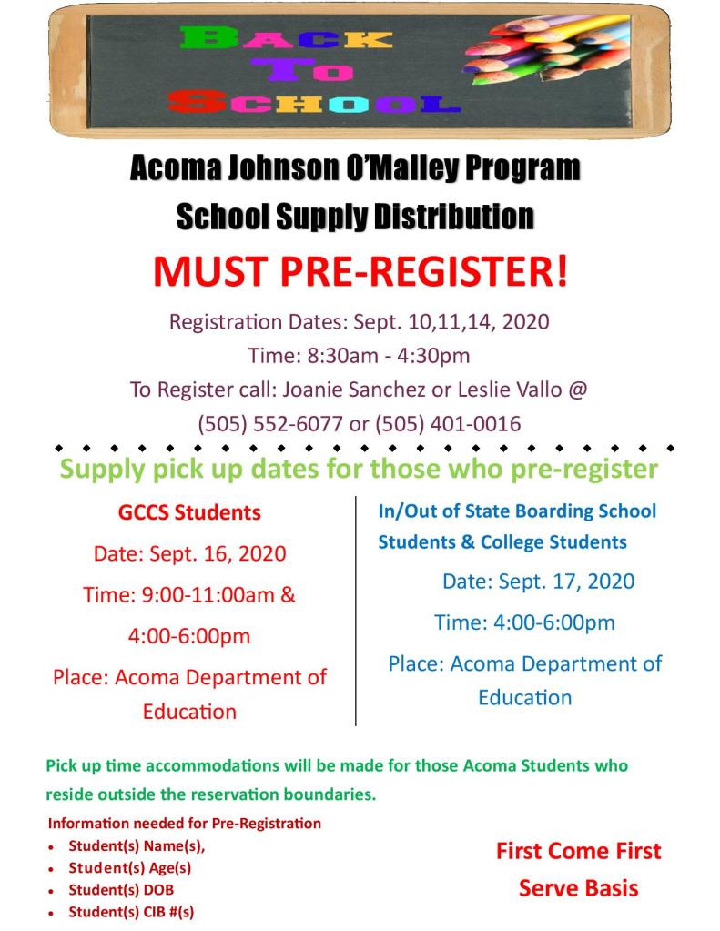 The Zoom link will be sent the morning of September 17th, 2020 to the email provided on the registration form. If you have any questions, you may contact the Acoma Department of Education at (505) 552-6077.
