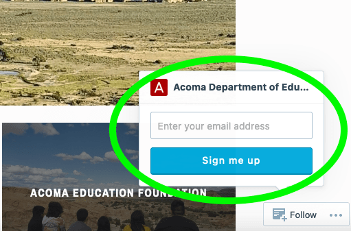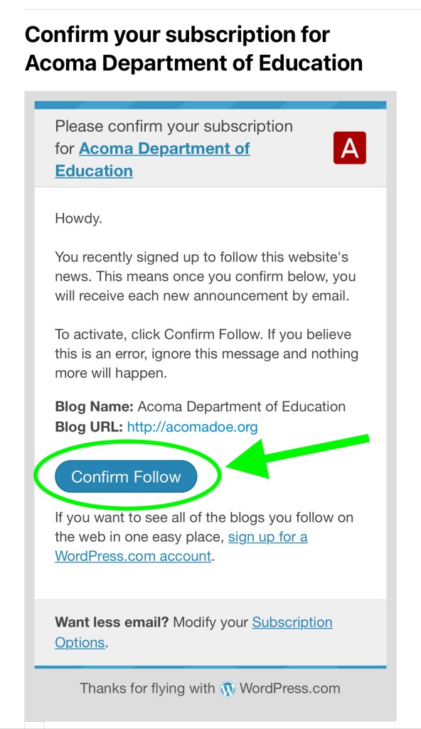 Check your email. You should find an email from “Acoma Department of Education” with the subject, “Confirm your subscription for Acoma Department of Education.” Click the blue Confirm Follow button.